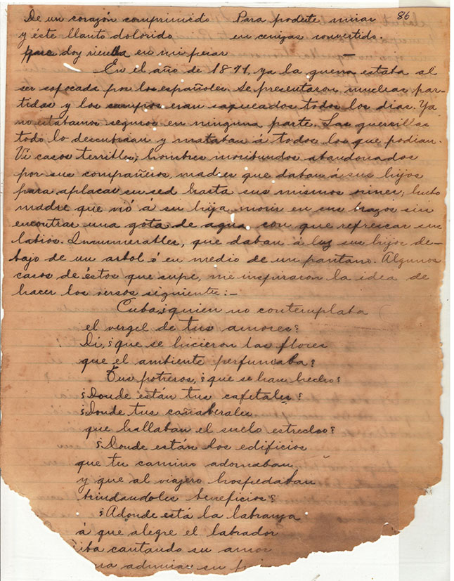 En el año de 1871 ya la guerra estaba al ser sofocada por los españoles. Se presentaron muchas partidas y los campos eran saqueados todos los días . Ya no estábamos seguros en ninguna parte. Las guerrillas todo lo descubrían y mataban a todos los que podían. Vi casos terribles, hombres moribundos abandonados por sus compañeros, madres que daban a sus hijos para aplacar su sed hasta sus mismos orines; hubo madre que vio a su hija morir en sus brazos sin encontrar una gota de agua con que refrescar sus labios. Innumerables que daban a luz sus hijos debajo de un árbol ó en medio de un pantano…(Doña Encarnación de Varona de Escobar)