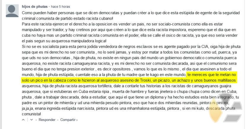 Estos comentarios de odio y mentiras, de antisemitismo, machismo, odio irracional a las personas de baja estatura y pintores académicos, etc. fueron publicados en Cubanet después que dicho sitio publicara el vÃdeo donde Eliecer y yo conversamos. Ese sitio es financiado por la NED (nacional endowment for democracy), o sea, con dinero publico. Después de varios dÃas, el sitio se dignó en eliminar estas incitaciones a la violencia pero si la linea editorial de ellos continua incitando la intolerancia polÃtica de revancha y los polÃticos siguen tratando de eliminar a sus similares con calificaciones mentirosas, entonces no habrá jamas un ambiente de paz entre los cubanos…pues el Internet cada vez más sustituye la vida real.